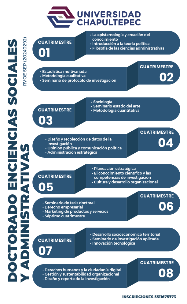 El Doctorado en Ciencias Sociales y Administrativas es un programa académico que tiene como objetivo formar investigadores, académicos y profesionales altamente especializados en el análisis y comprensión de fenómenos sociales, económicos, políticos y organizacionales. Este doctorado integra enfoques teóricos y metodológicos de las ciencias sociales (como la sociología, ciencia política, antropología, economía) y de las ciencias administrativas (como la gestión, administración pública, administración de empresas, entre otras), con una orientación multidisciplinaria y crítica.