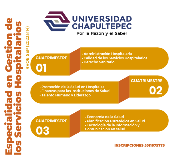 Gestión de los Servicios Hospitalarios es un programa académico de 9 meses de nivel superior orientado a la formación de profesionales con conocimientos sólidos en el ámbito de la administración y dirección de instituciones de salud, capaces de optimizar los recursos, mejorar la eficiencia operativa y promover el cumplimiento de los más altos estándares de calidad. A lo largo de la especialidad, el estudiante adquiere una formación integral en áreas como las finanzas en salud, la planeación estratégica hospitalaria, la gestión de la calidad y la legislación sanitaria. Además, desarrolla habilidades de liderazgo, análisis de datos y visión de negocio para desempeñarse con responsabilidad y solvencia.