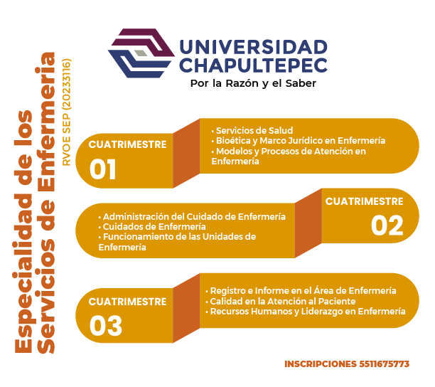 Servicios de Enfermería es un programa académico de 9 meses, de nivel superior orientado a la formación de profesionales con conocimientos sólidos en el ámbito del cuidado clínico avanzado, capaces de aplicar protocolos basados en evidencia, gestionar planes de atención de alta complejidad y promover la calidad y seguridad en diversos entornos de salud. A lo largo de la especialidad, el estudiante adquiere una formación integral en áreas como la valoración avanzada del paciente, la farmacología clínica, la gestión de cuidados y el liderazgo de equipos de enfermería. Además, desarrolla habilidades clínicas, analíticas y de pensamiento crítico para desempeñarse con excelencia y humanismo.