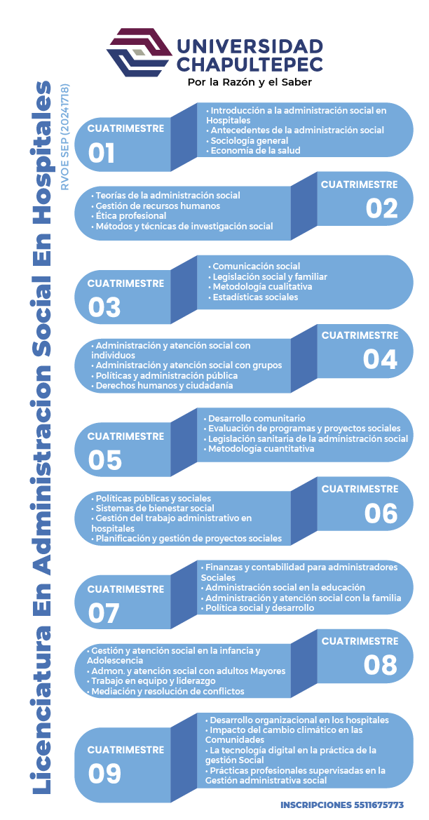 La Licenciatura en Administración Social en Hospitales forma profesionales en la gestión administrativa y social de instituciones de salud, orientados a optimizar recursos humanos, financieros y materiales para garantizar servicios hospitalarios eficientes, equitativos y de calidad. El egresado desarrolla competencias para diseñar y evaluar proyectos de salud, liderar equipos, aplicar políticas de bienestar social y promover la equidad, con un compromiso ético y centrado en los derechos humanos.