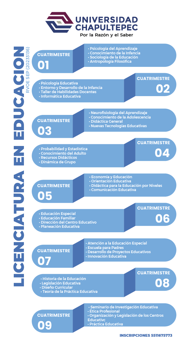 La Licenciatura en Educación prepara especialistas capaces de diseñar, implementar y evaluar estrategias de enseñanza-aprendizaje, con formación en teorías pedagógicas, psicología del desarrollo, planeación, evaluación, gestión escolar, tecnologías educativas y políticas públicas. El egresado puede desempeñarse como docente, asesor pedagógico, coordinador académico, diseñador de materiales, investigador o directivo en instituciones educativas y organizaciones sociales, con un enfoque incluyente, innovador y transformador.