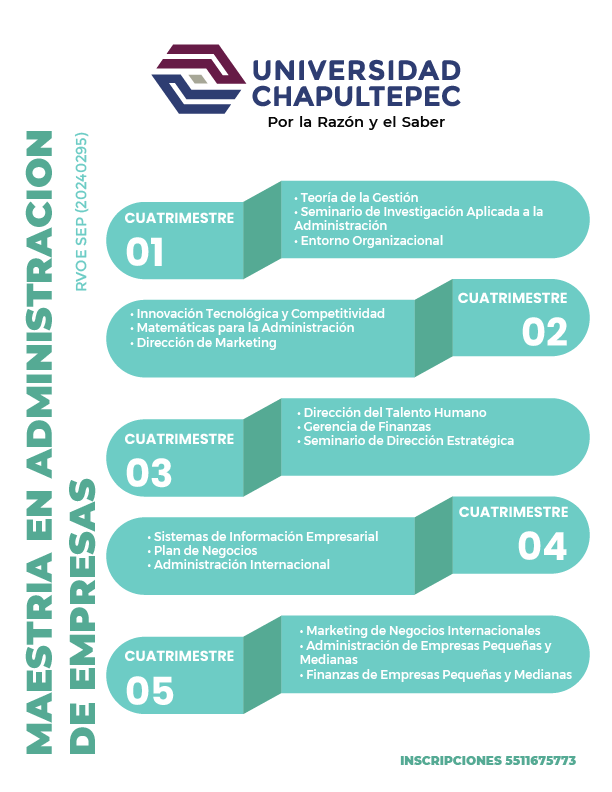 La Maestría en Administración de Empresas de 19 meses, tiene como propósito formar profesionales con una sólida preparación científica, ética y humanística, capaces de planificar, organizar, dirigir y controlar recursos y actividades empresariales, con el fin de alcanzar los objetivos institucionales de manera efectiva y estratégica. Se forma al profesional para liderar en contextos empresariales dinámicos y competitivos, tomando decisiones fundamentadas y promoviendo una gestión sostenible, ética y orientada a resultados.